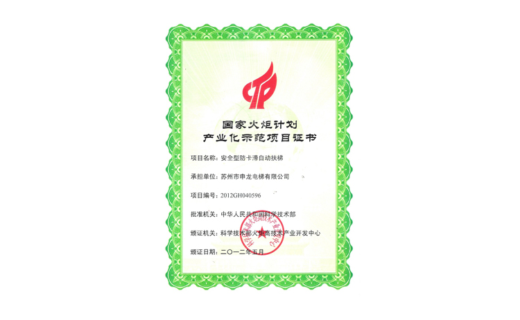 國(guó)家火炬計(jì)劃產(chǎn)業(yè)化示范項(xiàng)目證書(shū)