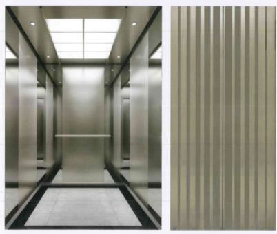 轎壁:三側(cè)轎壁均為中間香檳金噴砂兩側(cè)香檳金鏡面不銹鋼,底部鏡面不銹鋼腳線(xiàn)